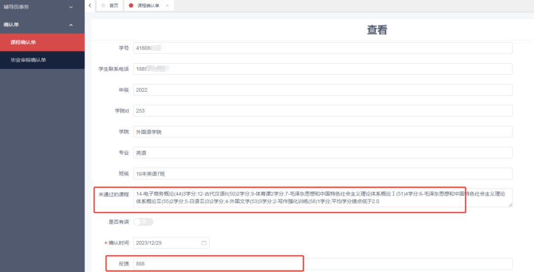 (1)单个学生查询:输入学号或姓名,点击“搜索”,可以查询单个学生的信息。点击“查看”,可以查询学生未通过的课程、是否确认、确认时间以及问题的反馈。
