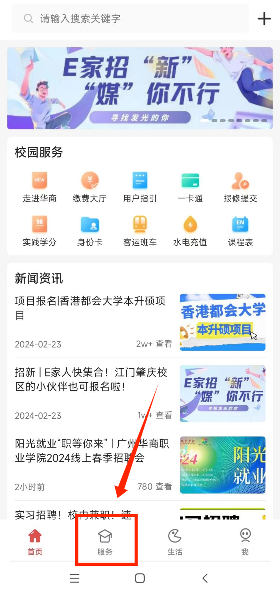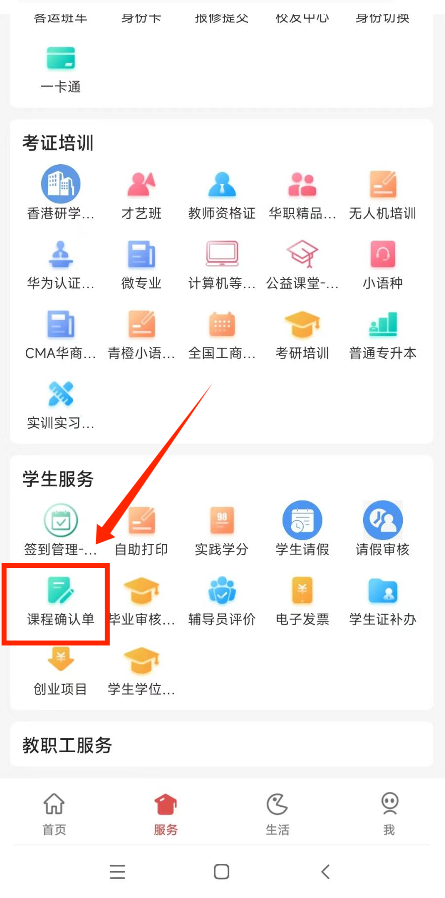 华商E家APP—点击底部的“服务”—在“学生服务”区域点击“课程确认单”。