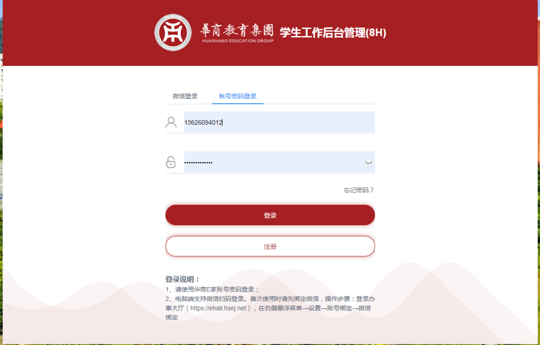 2.登录账号:教学秘书手机号,也就是华商e家的账号