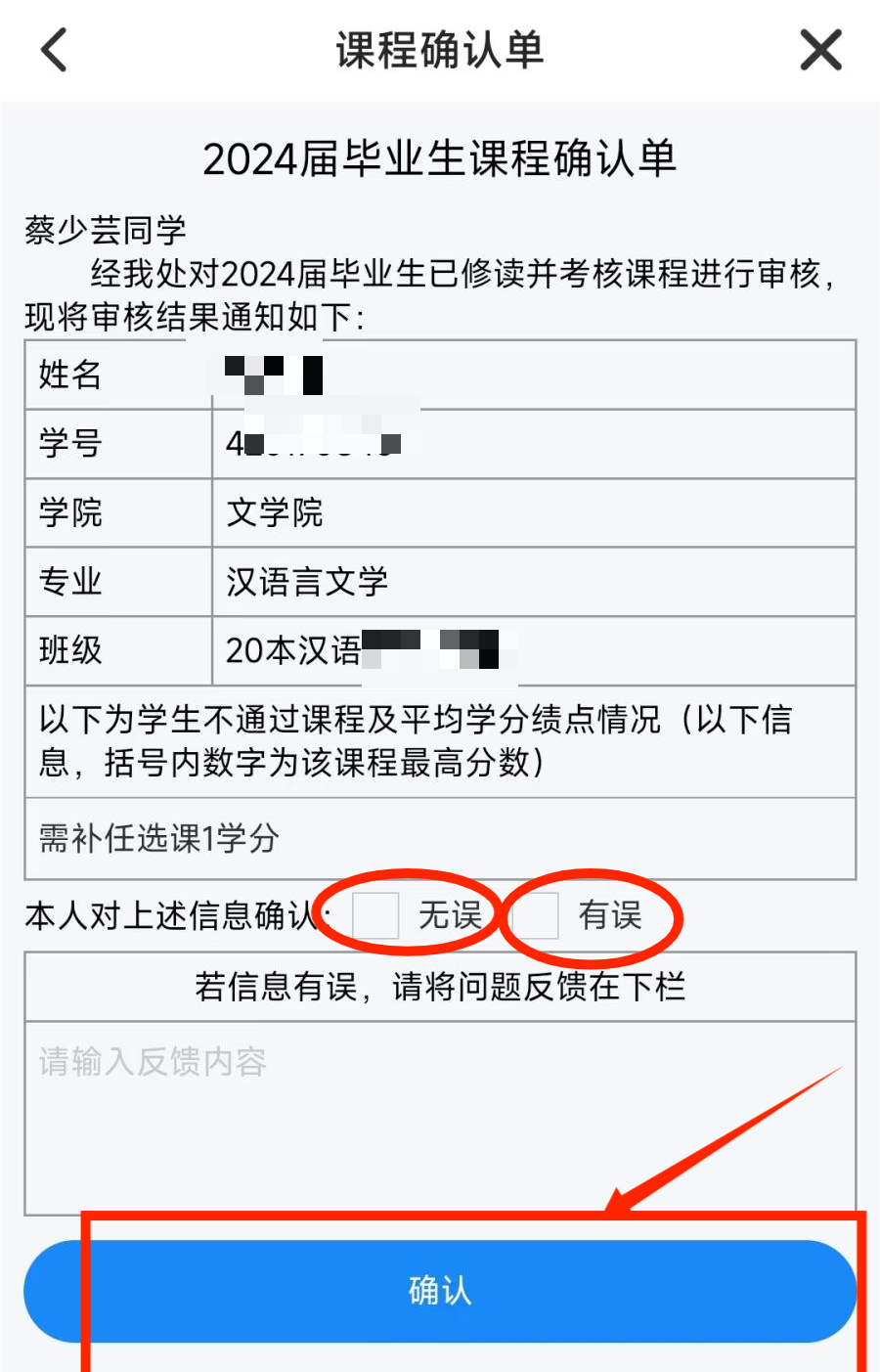 2.若审核结果与本人实际情况不符合,点击“有误”,请在问题反馈栏里具体说明,并点击“确认”提交。