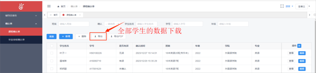 (3)数据下载:登录账号后,默认显示本学院全部毕业生,点击“导出”,可下载全部学生的数据,下载的数据包括学生是否确认课程结果、确认时间、未通过课程以及问题反馈。另外,点击“未确认”可以筛选出未确认课程结果的学生名单。点击“已确认”可以筛选出已经确认