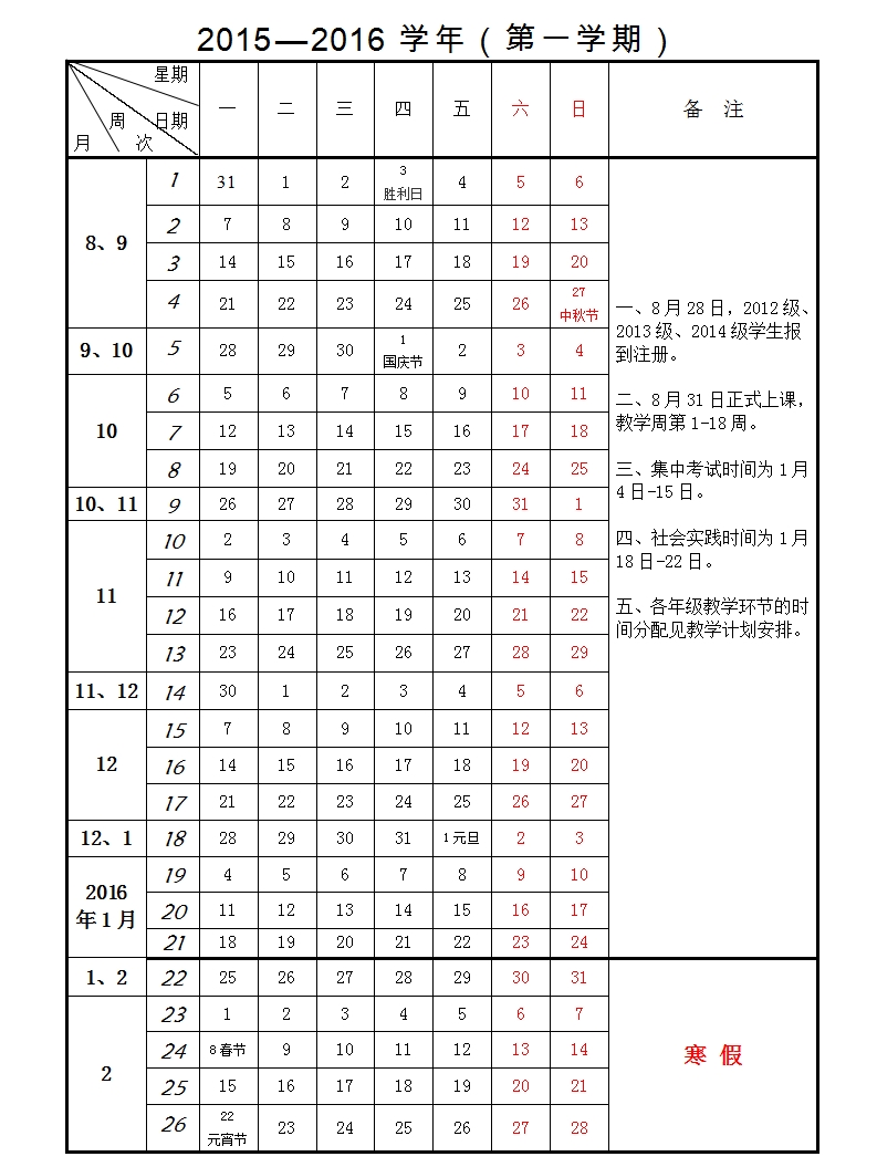 广东财经大学华商学院2015-2016学年校历