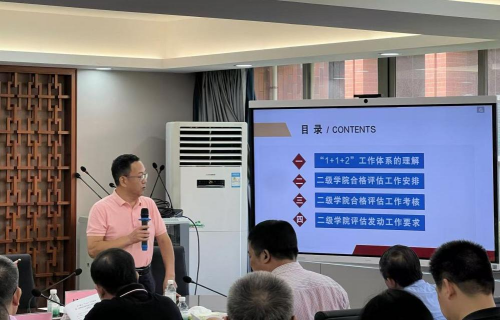 教评估中心主任杨小元对合格评估在二级学院层面如何推动进行了总体布置。他解读了学校合格评估“1+1+2”工作体系的内涵,强调《二级学院合格评估内涵建设责任清单》既是二级学院的工作清单,也是二级学院院长的责任状,二级学院合格评估的推进方式总的来说就是五要素模版(建设任务书)并附数据清单,滚动推进;他介绍了二级学院合格评估的考核内容及方式办法,对二级学院的合格评估发动工作提出了要求,他表示,合格评估是达标性评估,合格评估工作就是全校上下团结一心、心无旁骛、凝心聚力,充分理解准确把握合格评估的标准和要求,按照标准和要求,找准问题,找准差距,排除干扰,克服一切困难,强化各项建设,规范各项管理,达到三基本要求(办学条件基本达标、教学管理基本规范、教学质量基本保证),全校所有人都是合格评估工作者,他要求二级学院要自主组织开展合格评估调研,带着问题,深入交流,调研要“深度游”,不要“跟团游”,二级学院要主动“走出去”和“请进来”,开展培训,只有深刻理解了合格评估的政策要求和技术要求,工作起来才能思想不掉队,动作不变形。